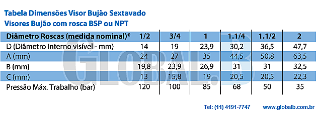 Sua construção dispensa o uso de elastômeros (anéis de vedação), devido a fusão entre o metal e o vidro, com isso aumenta significativamente a compatibilidade com diferentes tipos de fluídos, pois não há preocupação com o tipo de vedação entre corpo e vidro. Como padrão são fabricados com rosca NPT(cônica), mas fabricamos também em rosca BSP ou métrica permitindo uma melhor visualização do fluído.